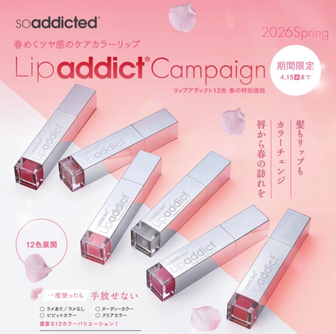 Lipaddict 201〜213 / 全12色 リップアディクト春のキャンペーン 【価格】 通常 ¥6,600 税込→ ¥5,500 税込) 【期間】 2026年3月5日〜4月15日 【対象商品】 Lipaddict 201〜213 全12色 ※ 新色 J01 は対象外 ✦発送時期 発送までに最短で5営業日ほどかかります。 予めご了承の上ご注文ください。 ✦人気アイテムのにつきメーカー欠品の場合はキャンセルとなります 【商品説明】 皮膚科専門医がテストし、商品科学者が考案したスキンケア美容液で、塗るたび、唇にハリと潤いを与えて輪郭を整えてくれます。 ヒアルロン酸や独自のペプチド、 オーガニックオイル ホホバ油・アボカド油などを配合。 うるおいをしっかり閉じ込めながら、 乾燥や縦ジワ、小ジワをケアし、 ぷるんとなめらかな唇へ導きます。 さらに、 年齢とともに減少しやすいコラーゲンやエラスチンに着目。 特許取得済みのコラーゲンブースターが 唇の縦ジワを目立ちにくくし、 ふっくら感となめらかさをサポートします。 使い続けることで、 唇の輪郭まで美しく整い、 口元全体がいきいきとした印象に。 ケアしながら、 ぷるぷるのツヤ唇へ。 毎日のリップケアを 【ご使用上の注意】 ・成分により塗ってから30秒ほどでぴりぴりとした感覚があります ・お肌に合わないときは使用をお止めください ・唇以外にはご使用いただけません ・傷や腫物、湿疹、かぶれ等、お肌に異常があるときはお使いにならないでください [成分] ヒアルロン酸、高濃度ペプチド、コラーゲン、ビタミン、ヒマシオイル、ホホバオイル、アルガンオイル、ザクロ種オイル、アボカドオイル、緑茶エキス、グレープシード、クコの実エキス、アサイ―エキス、ベリーエキス、植物由来の藻エキス、ビタミンC配合 [全成分] ポリブチレン アロエベラエキス パルミチン酸エチルヘキシル アボカド油アンズ核油 ブドウ種子油 ヒマシ油 ホホバ種子油 シリカ(VP/ヘキサデセン)コポリマー マイクロクリスタリンワックス トリ(カプリル/カプリン酸)グリセリル イソヘキサデカン 水 マイカ グリセリン BG トコフェロール ステビアエキス メンタアルベンシス シュウ酸メンチルエチルアミド ミドリハッカ葉オイル コラーゲン アスコルビン酸 ビス(PEG/PPG-14/14)ジメチコン カルボマー(エチレン/プロピレン/スチレン)コポリマー(ブチレン/エチレン/スチレン)コポリマー ポリソルベート20 パルミトイルオリゴペプチド パルミトイルテトラペプチド-7 アルゲエキス シクロペンタシロキサン ヒアルロン酸Na キサンタンガム フェノキシエタノールトリペプチド-1 トウガラシ果実エキス
