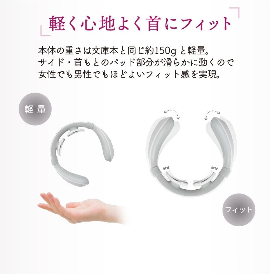 普段の生活ではなかなか鍛えることの難しい筋肉を微弱な電気刺激を与えることで筋肉を動かしトレーニングすると同時に、温熱ケアで筋肉の硬直を緩和し、首周りをリラックスした状態に保つことを目的としています。